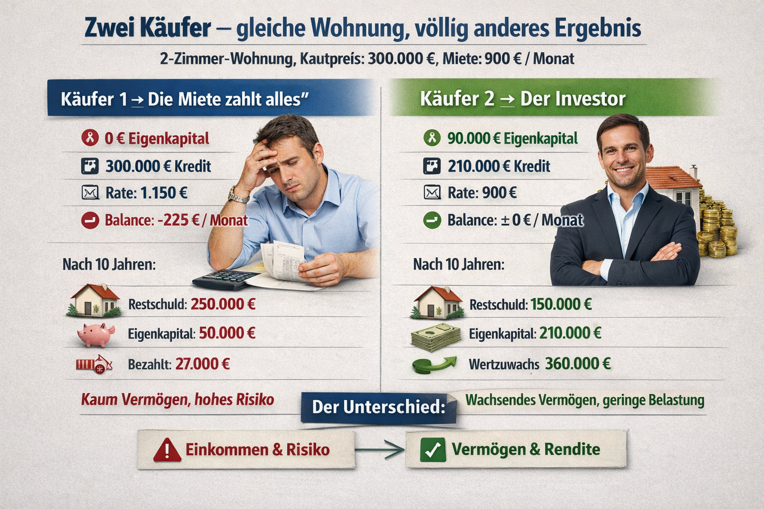 Genau darin liegt der zentrale Unterschied: Der Käufer versucht, von der Immobilie zu leben. Der Investor lässt die Immobilie für sein Eigenkapital arbeiten.